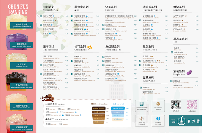 Chun Fun How (春芳號) is a Taiwanese bubble tea chain known for its floral cup designs and creative tea blends. Signature drinks like Osmanthus Oolong Milk Tea and Purple Yam Fresh Milk use premium Taiwanese ingredients. With a stylish, clean interior and Instagram-worthy presentation, it offers a unique blend of tradition and modern flair.eGift Card Offers