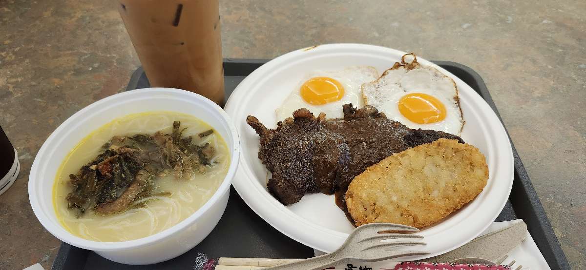 Pork cartilage macaroni that can be eaten without toothpaste, added two dollars toast scrambled eggs and a drink