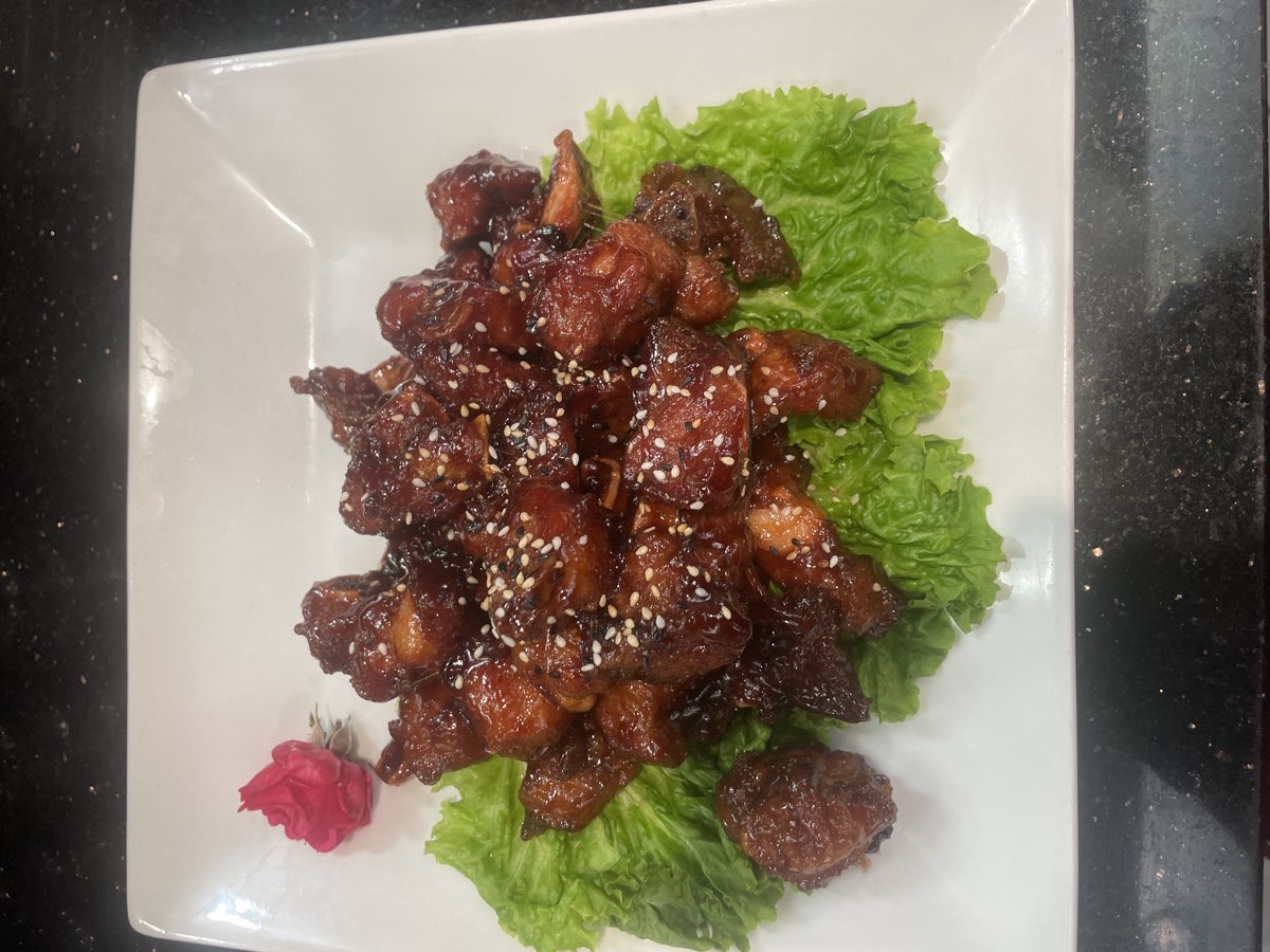 The pork ribs and rice cakes are made from a whole pork rib and several whole rice cakes cut apart. The stir-fried chicken and cabbage tasted good. But the overall portion felt small. It's not stressful to order alone.