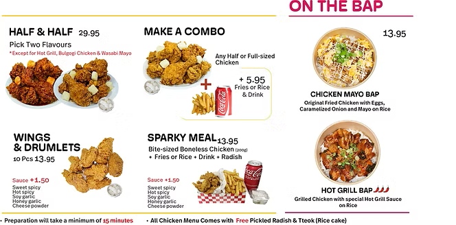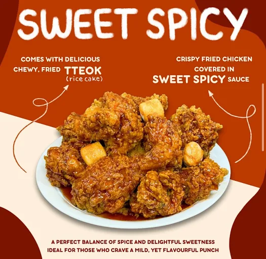 Signature Korean-fried chicken flavoursComplemented by grilled chicken and rice-cake sidesBest enjoyed hot in-store for crisp texture.
