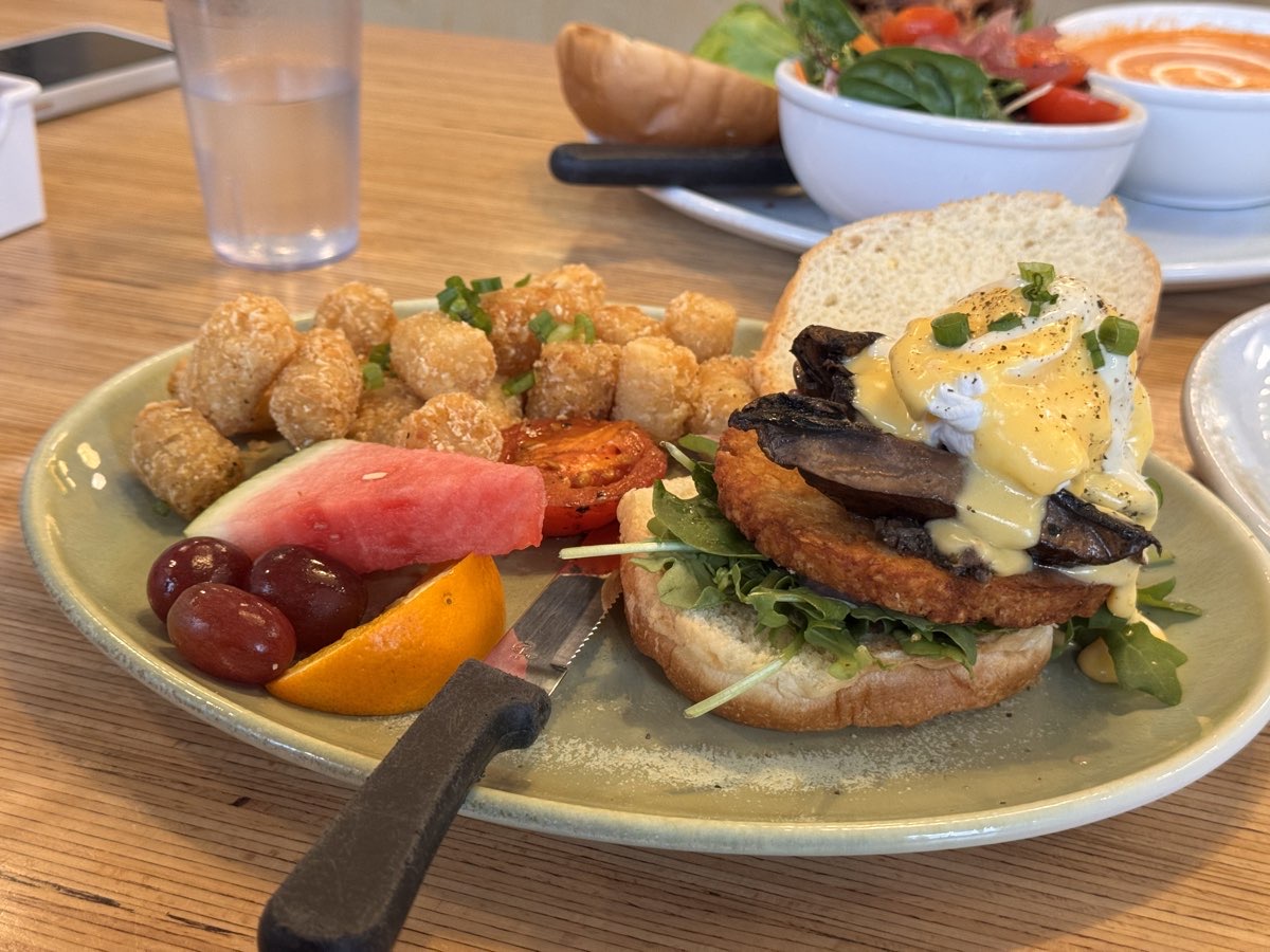 Like the portobello mushroom sandwich, the Yolks tots it comes with it is really nice too. the customer service is nice but kinda too much, whenever I have a bite or have the phone call they’ll call out “how’s everything”, I mean, I’m busy and working on it lol